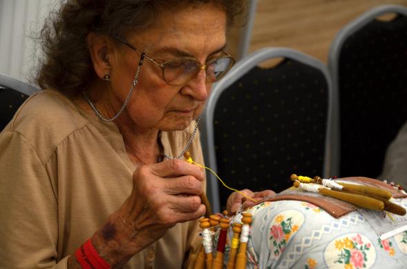 Iveta Žlnková a Oľga Mozoľová predviedli svoje zručnosti v paličkovaní čipky, pričom ich tvorba reprezentuje tradičné vzory z oblasti Hontu.