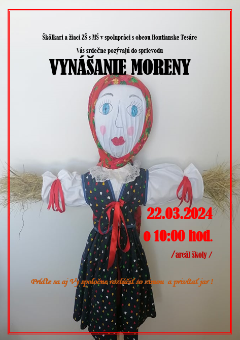 Škôlkari a žiaci ZŠ s MŠ v spolupráci s obcou Hontianske Tesáre Vás srdečne pozývajú do sprievodu VYNÁŠANIE MORENY 22. 03. 2024 o 10:00 začiatok bude pred ZŠ s MŠ Hontianske Tesáre.